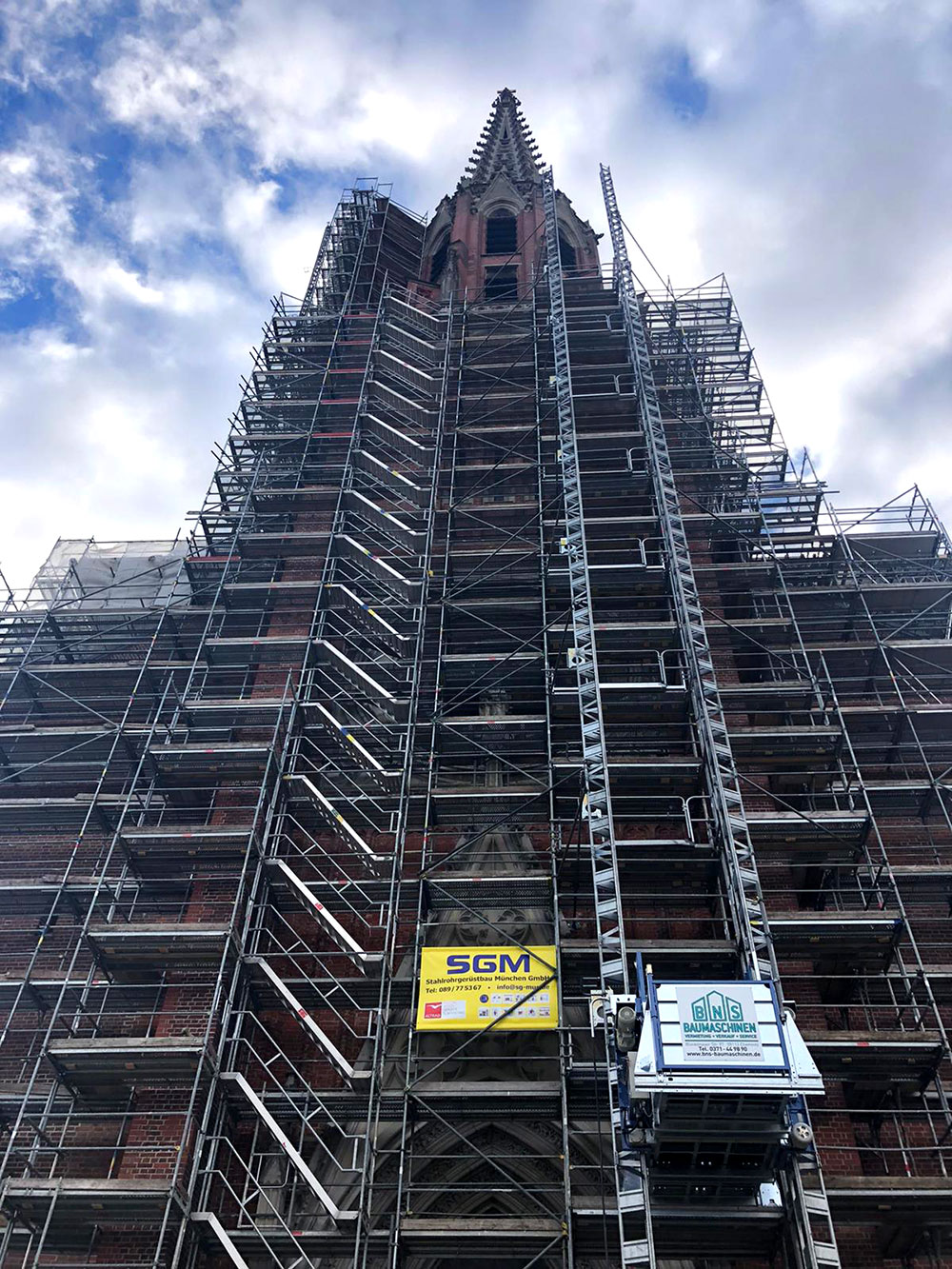 Im aufwändigen Bereich der Kirchenrestaurierungen stellen wir unser Können besonders gerne unter Beweis. Den einzelnen Gewerken den optimalen Zugang zu den zahlreichen Gewölben, Nischen und Erkern zu gewährleisten, ist uns eine Herzensangelegenheit. Der Schutz der historischen Bausubstanz sowie der sensiblen Kunst- und Sakralgegenstände im Innenbereich stehen für unsere Mitarbeiter dabei stets an erster Stelle.